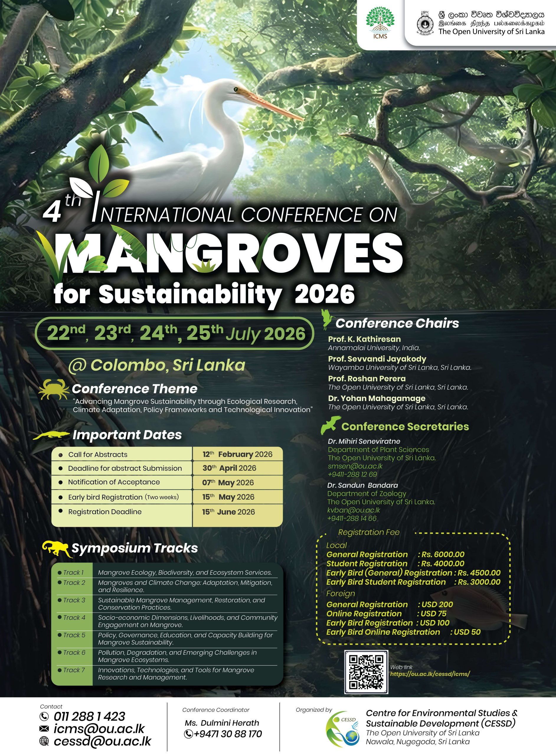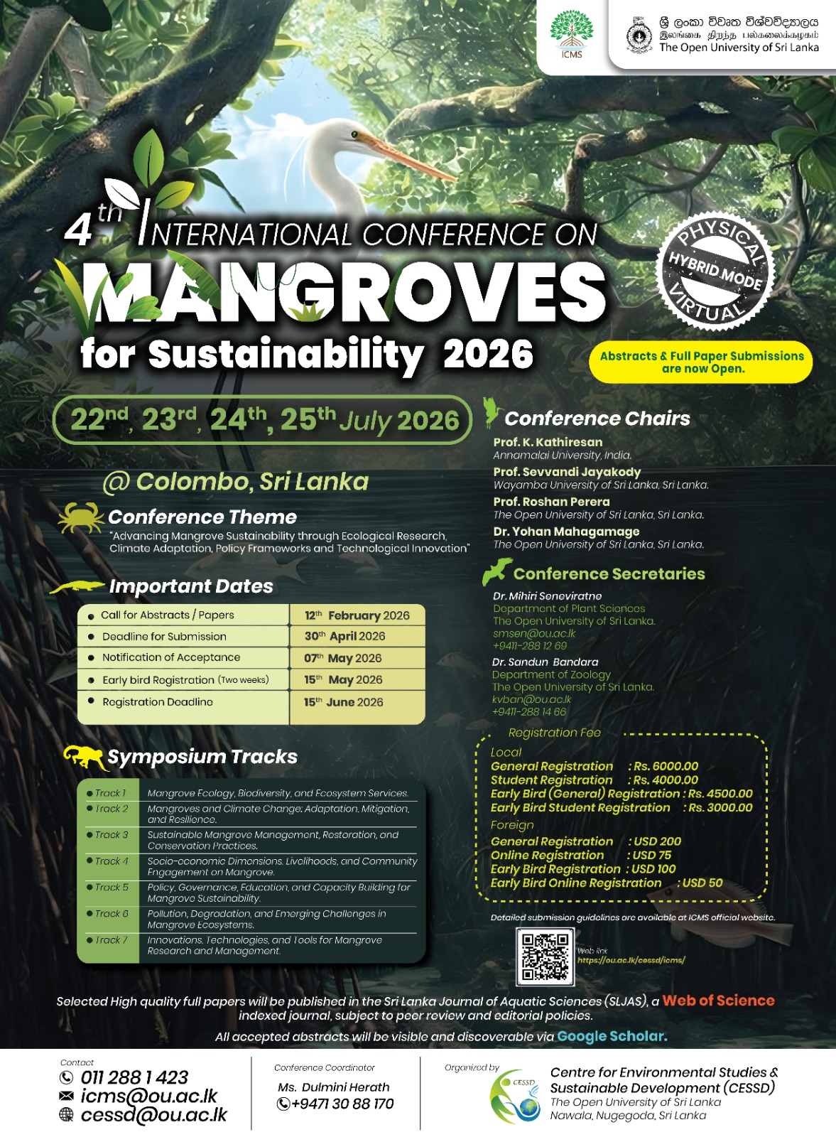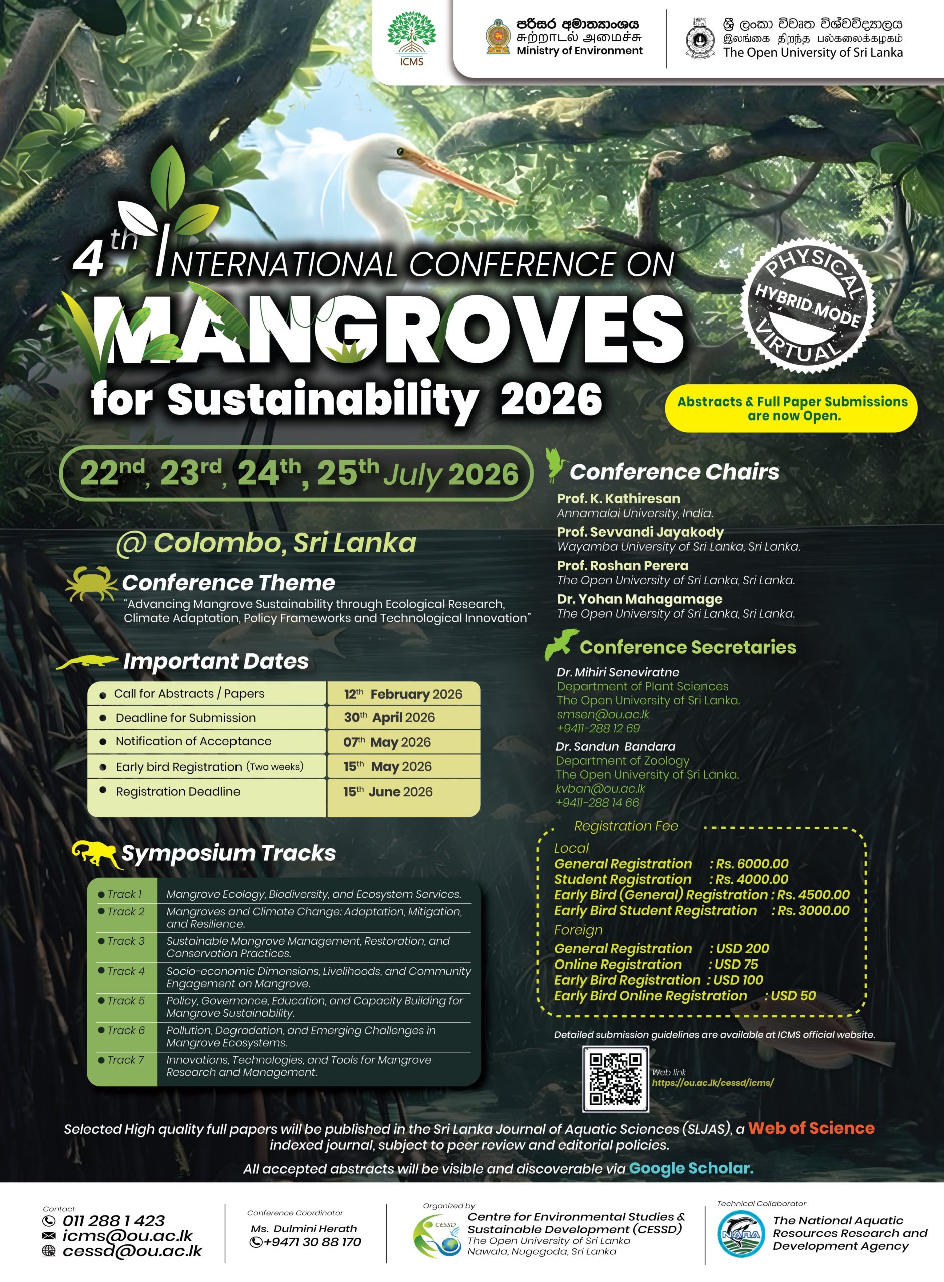 The International Conference on Mangroves for Sustainability (ICMS) is a global platform dedicated to promoting the conservation and sustainable management of mangrove ecosystems. It brings together researchers, policymakers, conservationists, and industry leaders to share knowledge, discuss challenges, and explore innovative solutions. ICMS focuses on key areas such as biodiversity conservation, climate resilience, coastal protection, and community engagement. Through interdisciplinary discussions and collaborative initiatives, the conference aims to advance research, influence policy, and develop effective strategies for the long-term sustainability of mangrove ecosystems worldwide.