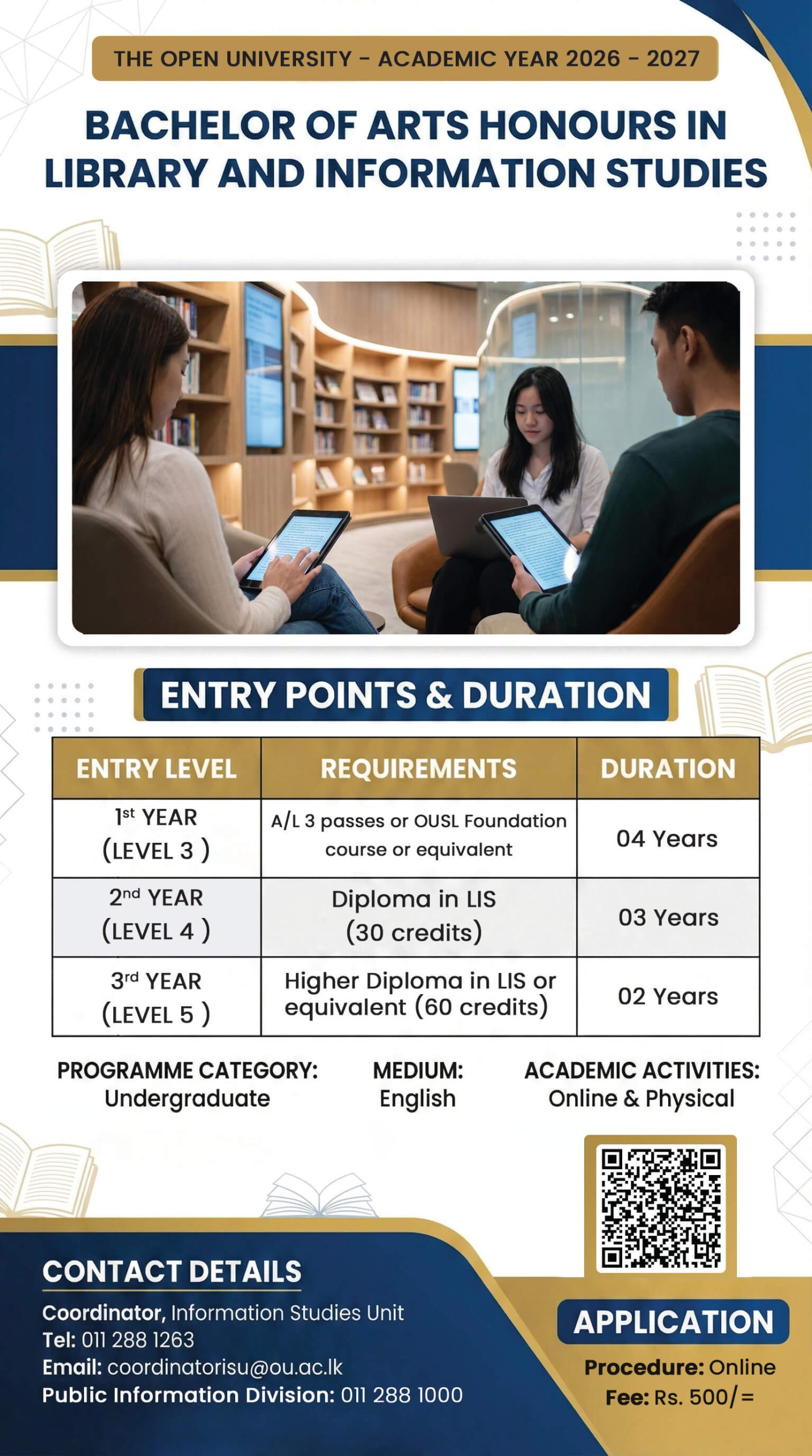 The Faculty of Humanities and Social Sciences offers the Degree of BA Hons in Library and Information Studies to students those who have completed G.C.E A/L and both Level 3 and 4 in Library Science.